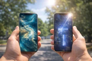 | Samsung’s anti-reflective display treatment can make the S25 Ultra easier to read outdoors, even though the iPhone measures brighter in lab testing. |